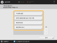 기기가 시작될 때 사용자가 로그인을 하도록 구성된다면(로그인 화면 표시 시점 지정하기), <기동/복구후 표시화면>은 <개인 설정>의 항목으로 표시됩니다. 기기가 시작된 후 표시되는 화면은 각 사용자를 위해 설정될 수 있습니다.