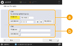 2 | 필요한 설정을 수행합니다. 환경에 따라 DNS 서버의 IP 주소를 입력합니다. ![]() 설정에 대한 자세한 내용은 제공업체나 네트워크 관리자에게 문의하십시오. ![]() <IPv4><주 DNS서버>를 누른 후, DNS 서버의 IPv4 주소를 입력합니다. 2차 DNS 서버가 있다면 IP 주소를 입력합니다. 2차 DNS 서버를 설정하지 않는 경우 "0.0.0.0"을 입력합니다. <IPv6><주 DNS서버>를 누른 후 DNS 서버의 IPv6 주소를 입력합니다. "ff"(멀티캐스트 주소)로 시작되는 주소, "0"만으로 구성된 주소 혹은 로컬 링크 주소는 입력할 수 없습니다. 2차 DNS 서버가 있다면 IP 주소를 입력합니다. "ff"(멀티캐스트 주소)로 시작되는 주소, "0"만으로 구성된 주소 혹은 로컬 링크 주소는 입력할 수 없습니다. 이 열은 공백으로 남길 수 있습니다. |