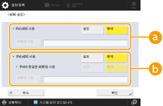 2 | 필요한 설정을 수행합니다. ![]() <IPv4 mDNS 사용>DNS 서버가 없는 환경에서 DNS 기능을 활성화하려면 <설정>을 누릅니다. <mDNS명 사용>을 누르고 영숫자 문자를 사용하여 원하는 mDNS 이름을 입력합니다. <IPv6 mDNS 사용>DNS 서버가 없는 환경에서 DNS 기능을 활성화하려면 <설정>을 누릅니다. mDNS 이름에 대한 IPv4와 같은 설정을 설정하려면 <IPv4와 동일한 mDNS명 사용>에 대해 <설정>을 누릅니다. 다른 설정을 사용하려면 <mDNS명 사용>을 누르고 영숫자 문자를 사용하여 원하는 mDNS 이름을 입력합니다. ![]() <IPv4 mDNS 사용>을 <설정>으로 설정하는 경우 기기가 완전히 슬립 모드로 진입하지 않습니다. <IPv6 mDNS 사용>을 <설정>으로 설정하는 경우 기기가 완전히 슬립 모드로 진입하지 않습니다. |