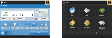 在 <首頁> 畫面上按下功能按鈕,會顯示可以存取影印、傳真和掃描等基本功能的基本功能畫面。雖然基本功能畫面的顯示和設定項目會由於功能而不同,不過您可以變更設定以符合您的需求。自訂基本功能畫面