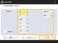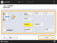 2 | 選擇信封類型。 ![]() 若要註冊自訂尺寸信封,請按下 <自訂> <下一步>,接著按下 <X> 或 <Y> 指定頁邊,然後使用數字鍵輸入指定頁邊的長度。 |