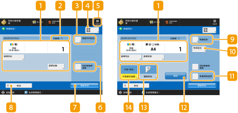 顯示例如要列印的紙張尺寸和列印份數等設定狀態。請務必確認設定以便可正確列印。若要變更設定,請按顯示區域下方的按鈕。若要變更列印份數,請使用數字鍵輸入數量。