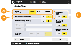 2 | Especifiqueu cada element. ![]() <Mètode autentic. POP>Establiu els mètodes d'autenticació del servidor POP3. Per codificar la contrasenya durant l'autenticació, seleccioneu <APOP>. Per autenticar usuaris en rebre correu (POP), seleccioneu <POP AUTH>. <Autenticació POP abans d'enviar>Per portar a terme l'autenticació utilitzant el servidor POP3, premeu <On>. <Permetre TLS (POP)>Per codificar la comunicació dirigida a i procedent del servidor POP3 utilitzant TLS, premeu <On>. Quan està establerta l'opció <On>, podeu confirmar el certificat de servidor TLS durant la comunicació amb el servidor i afegir CN als elements de verificació. <Confirmar certificat de TLS per rec. POP> |