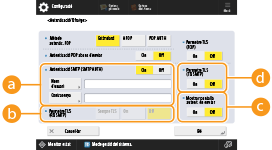 2 | Especifiqueu cada element. ![]() <Autenticació SMTP (SMTP AUTH)>Per utilitzar l'autenticació SMTP, premeu <On>, introduïu el nom d'usuari i la contrasenya dels comptes de correu especificats a <Nom d'usuari> i <Contrasenya>. ![]() Nom d'usuari i contrasenya Els camps <Nom d'usuari> i <Contrasenya> de l'opció <SMTP Authentication> també s'utilitzen en reenviar documents rebuts. Per dur a terme el reenviament, s'utilitza l'autenticació fixa de dispositius independentment del que hàgiu establert a <Informació utilitzada per autenticar servidor SMTP>. (<Informació utilitzada per autenticar servidor SMTP>) <Permetre TLS (RX SMTP)>Per codificar la comunicació utilitzant TLS en rebre correus electrònics i I-faxos utilitzant el servidor SMTP, premeu <Sempre TLS> o <On>. Si no voleu rebre dades que no estiguin codificades, seleccioneu <Sempre TLS>. <Mostrar pantalla autent. en enviar>Quan envieu correus electrònics i I-faxos, per visualitzar la pantalla d'introducció del nom d'usuari i la contrasenya, premeu <On>. <Permetre TLS (TX SMTP)>Per codificar la comunicació dirigida a i procedent del servidor SMTP utilitzant TLS, premeu <On>. Quan està establerta l'opció <On>, podeu confirmar el certificat de servidor TLS durant la comunicació amb el servidor i afegir CN als elements de verificació. <Confirmar certificat de TLS per env. SMTP> ![]() Quan establiu l'autenticació SMTP Especifiqueu un dels tres mètodes d'autenticació següents: Autenticació fixa de dispositius Introducció de la informació d'autenticació en fer enviaments Registre de la informació de cada usuari Autenticació fixa de dispositius: Quan s'utilitzen els camps <Nom d'usuari> i <Contrasenya> de l'opció <Autenticació SMTP (SMTP AUTH)> i la pantalla d'autenticació (<Iniciar sessió al servidor SMTP>) no es mostra en fer enviaments Especifiqueu les opcions següents: <Autenticació SMTP (SMTP AUTH)>: <On> <Nom d'usuari>: Introduïu el nom d'usuari. <Contrasenya>: Introduïu la contrasenya. <Mostrar pantalla autent. en enviar>: <Off> <Informació utilitzada per autenticar servidor SMTP>: <Opcions del dispositiu> Introducció de la informació d'autenticació en fer enviaments: Quan s'utilitzen els camps <Nom d'usuari> i <Contrasenya> de l'opció <Autenticació SMTP (SMTP AUTH)> i la pantalla d'autenticació (<Iniciar sessió al servidor SMTP>) es mostra en fer enviaments Els valors de <Nom d'usuari> i <Contrasenya> s'introdueixen a <Autenticació SMTP (SMTP AUTH)> com a informació d'autenticació per als enviaments. Si els camps <Nom d'usuari> i <Contrasenya> de l'opció <Autenticació SMTP (SMTP AUTH)> es deixen en blanc, la informació d'autenticació també quedarà en blanc. Especifiqueu les opcions següents: <Autenticació SMTP (SMTP AUTH)>: <On> <Nom d'usuari>: Introduïu el nom d'usuari. <Contrasenya>: Introduïu la contrasenya. <Mostrar pantalla autent. en enviar>: <On> <Informació utilitzada per autenticar servidor SMTP>: <Opcions del dispositiu> Registre de la informació de cada usuari: Quan s'utilitza el camp <Desar info. per a cada usuari> i la pantalla d'autenticació (<Iniciar sessió al servidor SMTP>) no es mostra en fer enviaments L'autenticació SMTP es porta a terme utilitzant el nom d'usuari i la contrasenya registrats al dispositiu local. Especifiqueu les opcions següents: <Autenticació SMTP (SMTP AUTH)>: <On> <Mostrar pantalla autent. en enviar>: <Off> <Informació utilitzada per autenticar servidor SMTP>: <Desar info. per a cada usuari> |