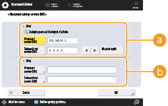 2 | Proveďte potřebná nastavení. Podle svého prostředí zadejte IP adresu serveru DNS. ![]() Další informace o nastavení získáte u svého poskytovatele nebo správce sítě. ![]() <IPv4>Stiskněte <Primární server DNS> a zadejte adresu IPv4 serveru DNS. Je-li nastaven sekundární server DNS, zadejte jeho IP adresu. Jestliže nenastavíte sekundární server DNS, zadejte „0.0.0.0“. <IPv6>Stiskněte <Primární server DNS> a zadejte adresu IPv6 serveru DNS. Nemůžete zadávat adresy začínající písmeny „ff“ (adresa vícesměrového vysílání), adresy sestávající ze samých nul „0“ nebo lokální linkové adresy. Je-li nastaven sekundární server DNS, zadejte jeho IP adresu. Nemůžete zadávat adresy začínající písmeny „ff“ (adresa vícesměrového vysílání), adresy sestávající ze samých nul „0“ nebo lokální linkové adresy. Tuto kolonku můžete ponechat prázdnou. |