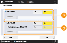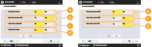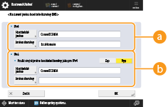 2 | Proveďte potřebná nastavení. ![]() <IPv4>Stiskněte <Hostitelské jméno> a s pomocí alfanumerických znaků zadejte hostitelské jméno stroje, které se má uložit na serveru DNS. Stiskněte <Jméno domény> a s pomocí alfanumerických znaků zadejte jméno domény, do níž stroj patří (Příklad: „priklad.com“). <IPv6>Chcete-li nastavit, aby hostitelské jméno a jméno domény bylo stejné jako IPv4, stiskněte <Zap> v <Použít stejné jméno hostitele/domény jako pro IPv4>. Chcete-li nastavit, aby jména byla odlišná od IPv4, stiskněte <Vyp>. Chcete-li nastavit, aby hostitelské jméno bylo odlišné od IPv4, stiskněte <Hostitelské jméno> a s pomocí alfanumerických znaků zadejte hostitelské jméno stroje, které se má uložit na serveru DNS. Chcete-li nastavit, aby jméno domény bylo odlišné od IPv4, stiskněte <Jméno domény> a s pomocí alfanumerických znaků zadejte jméno domény, do níž stroj patří. (Příklad: „priklad.com“). ![]() Nastavíte-li <Použít DHCPv6> na <Zap> pro nastavení stavové adresy (Nastavení adresy IPv6), ručně konfigurované jméno domény se přepíše. Nastavíte-li <Použít stejné jméno hostitele/domény jako pro IPv4> na <Zap>, použije se jméno domény získané ze serveru DHCPv6. |