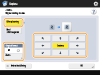 Inställning för förflyttningsriktning Beroende på originalets riktning och platsen där det placerats kommer bildens förflyttningsriktning att variera. När originalet placerats på originalglaset Övre kant mot sidkant: Bilden flyttas till höger och/eller längst ned. Övre kant mot bortre kant: Bilden flyttas till vänster och/eller längst ned. När originalet placeras i dokumentmataren Övre kant mot sidkant: Bilden flyttas till vänster eller till höger och/eller längst ned. Övre kant mot bortre kant: Bilden flyttas högst upp eller längst ned och/eller till höger. Om du använder funktionen Efter placering: Bilden flyttas men positionen anpassas så att hela bilden kopieras utan att bli avklippt. Om du använder funktionen Med siffertangenter: Den kopierade bilden kan bli avklippt. |