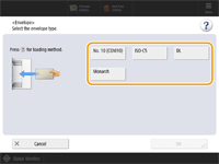 1 | Press <Envelope>. The envelope paper type cannot be selected from the details screen of <Paper Type>. To select the envelope paper type, register the paper type in <Register Favorite Paper (Multi-Purpose Tray)>, then press <Favorite Paper> in step 2 the button to which the envelope paper type has been registered <OK>. Registering Frequently Used Paper Size and Type for the Multi-purpose Tray |