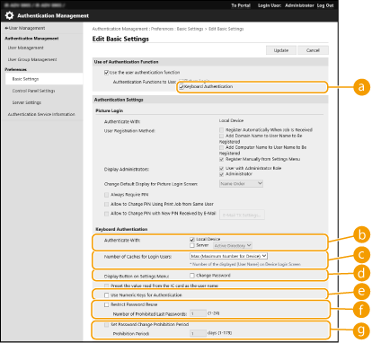 Whenever Picture Login is activated, the authentication device for keyboard authentication is fixed to [Local Device]. If you want to log in with a user account that is registered in an authentication server, disable Picture Login.