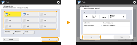Pour les fonctions « Copier » et « Numériser et envoyer », vous pouvez également configurer l'appareil afin de ne pas afficher l'écran de confirmation lors du rappel des paramètres enregistrés.
