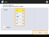 ![]() | Si vous voulez copier des originaux de formats libres ou des originaux très transparents, ou si vous voulez copier avec du papier installé dans le plateau multifonctions, vous devez sélectionner le papier manuellement. |