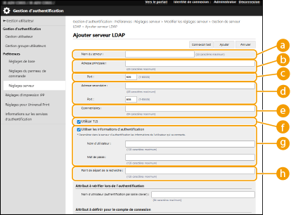 Pour spécifier un serveur Active Directory, LDAP ou Microsoft Entra ID comme dispositif d’authentification supplémentaire, vous devez enregistrer les informations du serveur utilisé pour l’authentification. Effectuez un test de connexion si nécessaire.