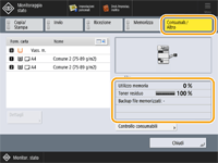 È possibile verificare la quantità residua di materiale di consumo tramite IU remota. Verifica dello stato della macchina |
