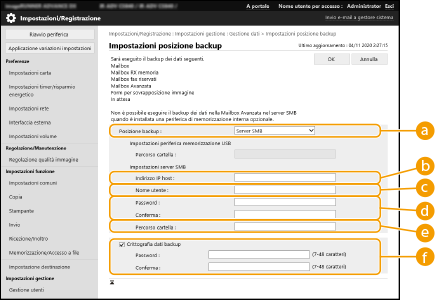 Una volta effettuato il backup, è possibile fare clic su [Registro backup/ripristino] sulla schermata visualizzata alla fase 7 e verificare i risultati del backup in [Risultato]. Se viene visualizzato il messaggio [Errore server.], non è possibile configurare correttamente le impostazioni di rete. Verificare le impostazioni di rete. I dati di backup possono essere ripristinati non solo nella macchina ma anche negli aggiornamenti dello stesso modello. |
