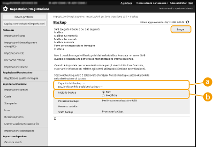 Non modificare né eliminare i dati di backup. Tale operazione potrebbe impedire il ripristino corretto dei medesimi. Non eseguire il backup mentre la macchina viene operata attraverso il pannello comandi o la IU remota. |