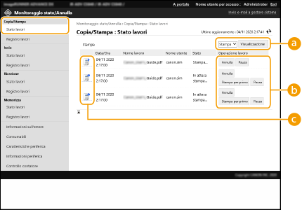 Avviare la IU remota [Monitoraggio stato/Annulla]  [Stato lavori] sotto [Copia/Stampa]