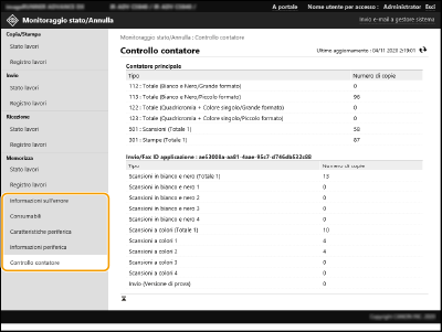 È possibile verificare un gran numero di informazioni sulla macchina, ad esempio informazioni sugli errori, quantità di carta e toner rimanenti, informazioni sulle apparecchiature opzionali collegate e numero totale di pagine che sono state stampate finora.