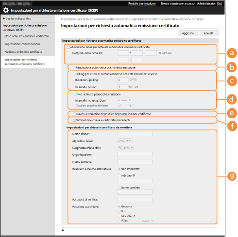 Fare clic su [Gestione periferiche]  [Impostazioni per richiesta rilascio certificato (SCEP)].