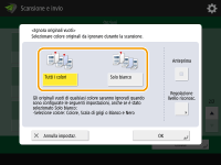Quando si seleziona un'impostazione diversa da <Autom. (Colore/B&N)> o <Autom. (Colore/Grigio)> in <Selezione colore>, viene eseguita la stessa operazione di <Tutti i colori>, anche se è impostato <Solo bianco>.