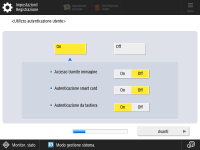 Per aumentare la sicurezza della macchina, utilizzare la macchina con un sistema che utilizza l'autenticazione utente. ![]() Questa macchina è impostata per utilizzare l'autenticazione utente come servizio di accesso. Per ulteriori informazioni, vedere Configurazione delle impostazioni di gestione dell'autenticazione personale. ![]() Premere <On> per <Utilizzo autenticazione utente>, premere <On> per il metodo di accesso da usare, quindi premere <Avanti>. Se non si utilizza l'autenticazione utente, premere <Off> per <Utilizzo autenticazione utente>, premere <OK>, quindi passare alla Fase 5. ![]() Specificare le seguenti impostazioni se nella macchina non sono registrati altri amministratori oltre all'utente "Administrator". ![]() Per aumentare la sicurezza della macchina disabilitando l'utente "Administrator" e registrando un nuovo amministratore, premere <Sì>. In <Registrazione amministratore>, immettere <Nome utente> e <Password>, quindi premere <OK>. Specificare <Indirizzo e-mail>, <ID divis.> e <Nome da visualizzare> secondo necessità. Per maggiori informazioni, vedere Registrazione delle informazioni utente nel dispositivo locale. L'utente "Administrator" viene disabilitato all'accesso successivo. Per operare come utente "Administrator", premere <No>. ![]() ![]() Selezionare la durata della visualizzazione della schermata di accesso. Se si seleziona <Visual. quando si selez. funz.>, premere <Funzioni>, selezionare la funzione per cui si desidera visualizzare la schermata di accesso e premere <OK>. Selezionare inoltre le voci delle impostazioni sulla schermata <Impostazioni/Registrazione> per cui visualizzare la schermata di accesso. Se si seleziona <Off> per <Autenticazione da tastiera>, premere <OK>. Procedere alla fase 5. Se è stato selezionato <On> per <Autenticazione da tastiera>, premere <Avanti>. ![]() ![]() Per utilizzare l'autenticazione tramite chiave numerica solamente sulla schermata di accesso, premere <On> e <OK>. | |