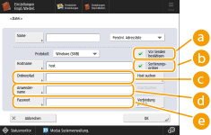 1 | Geben Sie den Hostnamen des Dateiservers/Erweiterter Platz ein, der die Daten überträgt. ![]() Fragen Sie den Netzwerkadministrator nach den Informationen des Dateiservers/Erweiterter Platz. <Protokoll>Wählen Sie eine der folgenden Optionen als Protokoll für den Dateiserver: <Windows (SMB)>, <FTP> oder <WebDAV>. Beim Senden eines Dokuments an Erweiterter Platz wählen Sie <Windows (SMB)> oder <WebDAV>. ![]() Wenn Sie <Windows (SMB)> auswählen, werden die Tasten <Host suchen> und <Durchsuchen> angezeigt. Sie können einen Dateiserver/Erweiterter Platz einfach angeben, indem Sie das Netzwerk durchsuchen oder anzeigen. Sie können <Durchsuchen> nur verwenden, wenn <1.0> auf <Ein> in <Version SMB-Client definieren> gesetzt ist. Sie können bis zu fünf Verzeichnisserver registrieren, die in <Durchsuchen> verwendet werden. <Hostname>Geben Sie den Hostnamen des Dateiservers/Erweiterter Platz ein. Wenn Sie <FTP> als Protokoll auswählen, muss der <Hostname> wie folgt eingegeben werden. Wenn TLS deaktiviert ist Beispiel: Um im gemeinsam genutzten Speicherplatz zu speichern: ftp://host name/share Um im persönlichen Speicherplatz zu speichern: ftp://host name/users Wenn TLS aktiviert ist Beispiel: Um im gemeinsam genutzten Speicherplatz zu speichern: ftps://host name/share Um im persönlichen Speicherplatz zu speichern: ftps://host name/users Beim Senden eines Dokuments an Erweiterter Platz geben Sie den <Hostname> wie folgt ein. Wenn Sie <Windows (SMB)> für das Protokoll auswählen Beispiel: Um im Shared Space zu speichern: \\192.168.100.50\share Um im persönlichen Speicherplatz zu speichern: \\192.168.100.50\users Wenn Sie <WebDAV> für Protokoll auswählen Wenn TLS deaktiviert ist Beispiel: Um im gemeinsam genutzten Speicherplatz zu speichern: http://<IP-Adresse oder Hostname> Um im persönlichen Speicherplatz zu speichern: http://<IP-Adresse oder Hostname> Wenn TLS aktiviert ist Beispiel: Um im gemeinsam genutzten Speicherplatz zu speichern: https://<IP-Adresse oder Hostname> Um im persönlichen Speicherplatz zu speichern: https://<IP-Adresse oder Hostname> <Verbindung prüfen>Drücken Sie diese Schaltfläche nach der Eingabe des Hostnamens, um die Verbindung zum Dateiserver/Erweiterter Platz zu bestätigen. ![]() Wenn Sie einen Anmeldeservice, wie z. B. die persönliche Authentifizierungsverwaltung, verwenden, müssen Sie <Anwendername> und <Passwort> eingeben. |