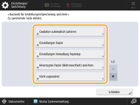 Sie können Schnelltasten für die Einstellungen registrieren, die beim Drücken von  (Einstellungen/Speicherung) angezeigt werden. Dies erfolgt unter <Einstellungen/Spch.Kurzwahl>. Auf diese Weise können Sie auch schnell auf solche Einstellungen zugreifen, die sich in verschachtelten Untermenüs befinden.