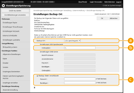 Ändern oder löschen Sie die gesicherten Daten nicht. Andernfalls werden Sie möglicherweise nicht in der Lage sein, die Daten ordnungsgemäß wiederherstellen. Starten Sie eine Sicherung nicht, während das Gerät über das Bedienfeld oder Remote UI anderweitig bedient wird. |