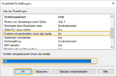 Aktivieren Sie [Ein] unter [Funktion mit geschütztem Druck des Geräts], und klicken Sie auf [OK].