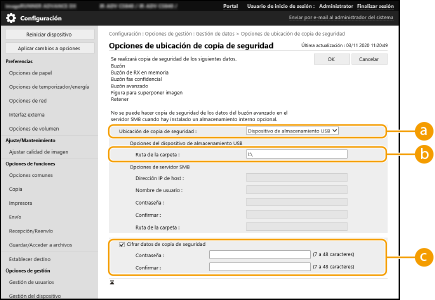 Puede hacer una copia de seguridad de los datos guardados en el equipo en un dispositivo de almacenamiento externo o un servidor SMB. Si realiza la copia de seguridad antes de actualizar el firmware o inicializar las opciones, puede restaurar las opciones si se produce un problema. Para realizar estas operaciones tiene que iniciar una sesión con privilegios de Administrador.