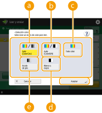 <Todo color>Escanea en color independientemente del color del documento. Según el estado del color del original, podría ser detectado como original en blanco y negro durante el escaneo, incluso si establece <Auto (Color/B/N)>. Para evitar esto, establezca el modo de color como <Todo color>.
