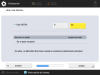 Especifique las opciones de la conexión de red. ![]() ![]() Pulse <Sí> para <Usar IPv4> o <Usar IPv6>, y pulse <Siguiente>. También puede utilizar IPv4 e IPv6. Si pulsa <No> para <Usar IPv4> y <Usar IPv6>, y pulsa <Aceptar>, omita las opciones de red y siga con el Paso 9. ![]() Si pulsa <Sí> para <Usar IPv4>, especifique las opciones siguientes. ![]() Para obtener la dirección IP automáticamente, pulse <DHCP> o <IP autom.>, y pulse <Siguiente> o <Aceptar>. Para configurar la dirección IP manualmente, quite la selección de <DHCP> o de <IP autom.>, pulse <Dirección IP>, <Máscara de subred> y <Dirección de puerta enlace> para introducir cada valor, y pulse <Siguiente> o <Aceptar>. Para obtener información sobre las opciones de la dirección IPV4, consulte Configurar una dirección IPv4. ![]() Si pulsa <Sí> para <Usar IPv6>, especifique las opciones siguientes. ![]() Pulse <Sí> para utilizar la dirección sin estado, o <No> para no utilizarla, y pulse <Siguiente>. Para obtener información sobre la dirección IPv6, consulte Configurar una dirección IPv6. ![]() Tras especificar la dirección sin estado, indique las opciones siguientes. ![]() Pulse <Sí> para utilizar la dirección manual, o <No> para no utilizarla, y pulse <Siguiente>. Para utilizar la dirección manual, pulse <Dirección manual>, <Longitud de prefijo>, y <Direc. enrutador prefij.> para introducir cada valor. ![]() Tras especificar la dirección manual, indique las opciones siguientes. ![]() Pulse <Sí> para utilizar DHCPv6 o <No> para no utilizar DHCPv6, y pulse <Aceptar>. | |