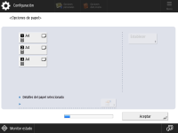 Compruebe que el papel cargado en los casetes está bien especificado. ![]() ![]() Si los tamaños del papel son correctos, pulse <Aceptar>. Para obtener información en pantalla e instrucciones sobre cómo cambiar las opciones, consulte Especificación del tamaño y tipo de papel en el casete. Si no ha iniciado sesión como administrador, continúe con el paso 10. | |