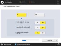 Para aumentar la seguridad del equipo, utilícelo en un sistema que emplee autenticación de usuario. ![]() Este equipo está configurado para emplear la autenticación de usuario como servicio de inicio de sesión. Para obtener más información, consulte Configurar las opciones de la administración de autenticación personal. ![]() Pulse <Sí> para <Usar autenticación de usuario>, pulse <Sí> para el método de inicio de sesión que se va a utilizar y pulse <Siguiente>. Si no emplea la autenticación de usuario, pulse <No> para <Usar autenticación de usuario>, pulse <Aceptar> y siga con el Paso 5. ![]() Indique las opciones siguientes si no hay administradores aparte del usuario "Administrador" registrado en el equipo. ![]() Si desea mejorar la seguridad del equipo deshabilitando el usuario "Administrador" y registrando un nuevo administrador, pulse <Sí>. En <Registrar Administrator>, introduzca <Nombre de usuario> y <Contraseña>, y pulse <Aceptar>. Especifique <Dirección de e-mail>, <ID dpto.> y <Mostrar nombre> según sea necesario. Para obtener más información, consulte Registrar la información de usuario en el dispositivo local. El usuario "Administrador" estará desactivado la próxima vez que inicie sesión. Para actuar como "Administrador", pulse <No>. ![]() ![]() Seleccione el momento en que desea mostrar la pantalla de inicio de sesión. Si selecciona <Mostrar si se selecciona Func>, pulse <Funciones>, seleccione la función de la que desea mostrar la pantalla de inicio de sesión y pulse <Bien>. Seleccione también los elementos de configuración de la pantalla <Configuración> de los que desea que se muestre la pantalla de inicio de sesión. Si selecciona <No> para <Autenticación mediante teclado>, pulse <Aceptar>. Diríjase al paso 5. Si selecciona <Sí> para <Autenticación mediante teclado>, pulse <Siguiente>. ![]() ![]() Para utilizar la autenticación a través de la entrada mediante solo teclas numéricas, pulse <Sí> y <Aceptar>. | |