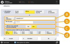 2 | Saisissez le nom d'utilisateur et le mot de passe, puis faites les réglages nécessaires. ![]() <Nom d'utilisateur>Saisissez le nom d'utilisateur de l'appareil enregistré sur le serveur LDAP (exemple :"utilisateur1"). <Mot de passe>Saisissez le mot de passe enregistré sur le serveur LDAP. Une fois le mot de passe saisi, <Confirmer> s'affiche afin de vous inviter à confirmer votre saisie. Saisissez de nouveau le mot de passe. <Nom de domaine>Saisissez le nom de domaine de l'appareil. <Afficher écran authentif. lors de la recherche>Appuyez sur <Oui> pour afficher l'écran de saisie du nom d'utilisateur et du mot de passe pour rechercher des destinataires. |