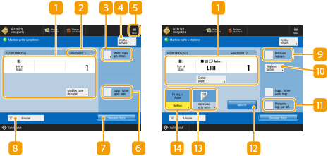 Affiche le statut du paramétrage comme le format du papier sur lequel imprimer et le nombre d'impressions, etc. Assurez-vous de confirmer les paramètres afin d'imprimer correctement. Pour modifier le format du papier, appuyez sur le bouton sous la section affichage. Pour modifier le nombre d'impressions, saisissez le nombre à l'aide des touches numériques.