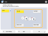 Um finalizador pode ser necessário dependendo da função de finalização. As peças e suas funções Dependendo do tipo de papel, você não poderá usar as funções de acabamento. Especificações de hardware Você pode especificar qual procedimento realizar quando há muitas folhas para grampear. <Action When Too Many Sheets to Staple> Ao definir as configurações em <Access Stored Files>As funções de acabamento podem ser usadas apenas quando você imprime um arquivo PDF/XPS ou um arquivo armazenado na Caixa de Mensagem. |