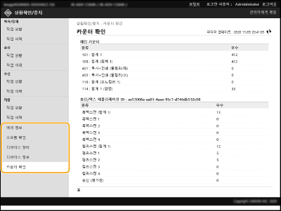 에러 정보, 용지 및 토너 잔량, 설치된 옵션 장치 정보 및 현재까지 인쇄된 총 페이지 수 등 기기에 대한 다양한 정보를 확인할 수 있습니다.