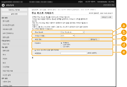 3 | 필요한 설정을 구성합니다. ![]() 현재 주소록이 삭제되고 가져오기 한 주소록 정보로 덮어쓰기 됩니다. 가져오기 중에는 기기가 재시작되기 전까지 리모트 UI에서 작업을 실행할 수 없습니다. 또한, 가져온 설정은 기기가 재시작된 이후에 적용됩니다.기기 종료/재시작 하기 ![]() [파일형식]가져오기 할 파일의 데이터 형식을 선택합니다. 데이터를 내보낸 다기능 프린터의 모델에 따라 파일 형식은 달라질 수 있습니다. 가져올 파일을 확인합니다. [파일 경로][찾아보기...]를 클릭하고 가져오기할 파일을 지정합니다. [주소 리스트의 인증 정보 복호화]암호화된 파일을 가져오기 하는 경우, 확인란을 선택하고 설정 데이터를 내보낼 때 입력한 것과 동일한 비밀번호를 입력합니다. |