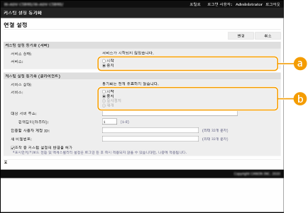 리모트 UI를 사용하여 동기화 시작 관련 설정을 지정하고 동기화를 시작합니다. 등록을 위해 관리자 권한이 필요합니다.