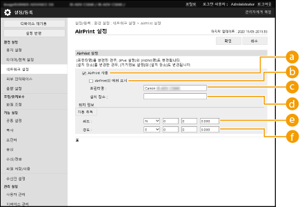 기기 이름 및 설치 위치를 포함하여 기기 식별에 사용되는 정보를 등록할 수 있습니다. AirPrint 사용에 필요한 설정을 리모트 UI를 사용하여 원격으로 구성할 수 있습니다.