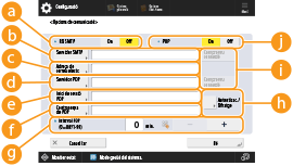 Per enviar directament documents llegits per correu electrònic/I-fax sense passar per un ordinador, heu de configurar opcions de comunicació com ara un servidor de correu, mètodes d'autenticació, etc. Normalment, s'utilitza un servidor SMTP per enviar i un servidor SMTP o POP3 per rebre. Podeu configurar la codificació i altres paràmetres. Per obtenir informació detallada sobre les opcions necessàries, poseu-vos en contacte amb el proveïdor de serveis d'Internet o els administradors de la xarxa.