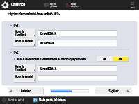 Especifiqueu l'adreça del servidor DNS, el nom de l'amfitrió DNS i el nom del domini DNS. ![]() ![]() Premeu <Servidor DNS primari> i <Servidor DNS secundari>, introduïu l'adreça IPv4/IPv6 del servidor DNS i premeu <Següent>. Per obtenir informació sobre les opcions de l'adreça del servidor DNS, vegeu Configuració d'opcions de DNS. ![]() ![]() Premeu <Nom de l'amfitrió> per introduir el nom de l'equip (nom d'amfitrió). Premeu <Nom de domini> per introduir el nom de l'àmbit al qual pertany l'equip i premeu <Següent>. Si la configuració de l'IPv4 i l'IPv6 és la mateixa, premeu <On> per <Usar el mateix nom d'amfitrió/nom de domini que per a IPv4>. ![]() ![]() Per actualitzar automàticament utilitzant les Opcions d'actualització dinàmica de DNS, premeu <On> per a <Actualització dinàmica de DNS> i premeu <Bé>. Si establiu l'opció <Actualització dinàmica de DNS> per a <IPv6> en <On>, seleccioneu <On> perquè els elements es desin automàticament. | |