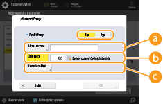 <Nastavit ověření>Stisknutím nastavíte autentizační informace při použití autentizační funkce proxy serveru. Stiskněte <Zap> na zobrazené obrazovce, zadejte uživatelské jméno a heslo pro proxy autentizaci a stiskněte <OK>.
