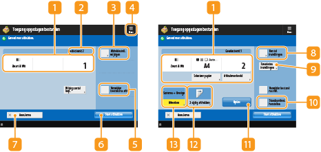Geeft instellingenstatus weer, zoals het papierformaat om op af te drukken en het aantal afdrukken. Controleer de instellingen om goed te kunnen afdrukken. Om de instellingen te wijzigen, drukt u op de knop onder het weergavegedeelte. Om het aantal afdrukken te wijzigen, voert u met de numerieke toetsen het aantal in.
