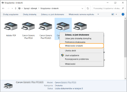 Kliknij prawym przyciskiem myszy ikonę drukarki urządzenia, a następnie kliknij [Właściwości drukarki].