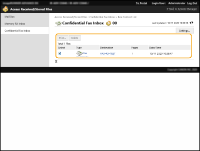 ![]() | Możesz skorzystać z interfejsu Remote UI (Zdalny interfejs użytkownika), aby drukować, wysyłać lub kasować pliki zapisane w Skrzynce pocztowej lub faksy i I-faksy tymczasowo zapisane w Skrytce faksu/I-faksu. |
