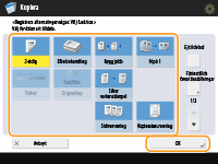 Antalet inställningsalternativ på skärmbilden med grundläggande funktioner för kopiering och platsen de visas på varierar beroende på funktionerna. En genvägsknapp visas inte om <Ej tilldelad> är inställd som en genväg. Begränsning för antalet genvägar för <Alternativ> som du kan registrera är enligt följande. Kopiering: 5 Fax: 4 Scanna och skicka: 2 |
