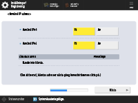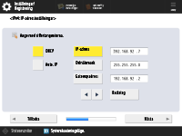Ange inställningar för nätverksanslutning. ![]() ![]() Tryck på <På> för <Använd IPv4> eller <Använd IPv6> och tryck sedan på <Nästa>. Du kan också använda både IPv4 och IPv6. Om du trycker på <Av> för <Använd IPv4> och <Använd IPv6> och sedan på <OK>, hoppar du över nätverksinställningar och går vidare till steg 9. ![]() Om du trycker på <På> för <Använd IPv4>, anger du följande inställningar. ![]() För att hämta IP-adress automatiskt, tryck på <DHCP> eller <Auto. IP> och tryck på <Nästa> eller <OK>. Om du vill ange IP-adressen manuellt, rensa valet för <DHCP> eller <Auto. IP>, tryck på <IP-adress>, <Delnätsmask> och <Gatewayadress> för att ange varje värde och tryck på <Nästa> eller <OK>. Information om IPv4-adressinställningar finns i Ställa in en IPv4-adress. ![]() Om du trycker på <På> för <Använd IPv6>, anger du följande inställningar. ![]() Tryck på <På> för att använda en tillståndslös adress eller <Av> för att inte använda en tillståndslös adress och tryck på <Nästa>. För information om IPv6-adressen, se Ställa in en IPv6-adress. ![]() När du har angett tillståndslös adress, ange följande inställningar. ![]() Tryck på <På> för att använda manuell adress eller <Av> för att inte använda manuell adress och tryck sedan på <Nästa>. Om du vill använda en manuell adress, tryck på <Manuell adress>, <Prefixlängd> och <Standardrouteradress> för att ange varje värde. ![]() När du har angett manuell adress, ange följande inställningar. ![]() Tryck på <På> för att använda DHCPv6 eller <Av> om du inte vill använda DHCPv6 och tryck sedan på <OK>. | |