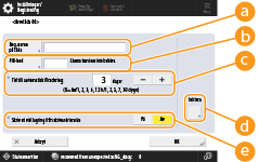 <Tid till automatisk filradering>Tryck på <->/<+> för att ändra tiden tills sparade filer automatiskt tas bort. Om du anger "0", tas filer inte bort.