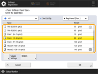 If the paper type of the paper that you have loaded is not listed on the detailed setting screen, you can register it in the paper type list.